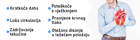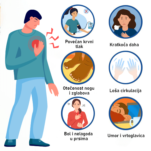 Znakovi i simptomi kardiovaskularnih problema mogu se razviti tijekom vremena kako funkcija srca postepeno opada. Loše zdravlje srca može dovesti, između ostalog, do povišenog krvnog tlaka, smanjene isporuke kisika, slabe cirkulacije i oteklina. Ovisno o težini, srčani problemi mogu rezultirati: