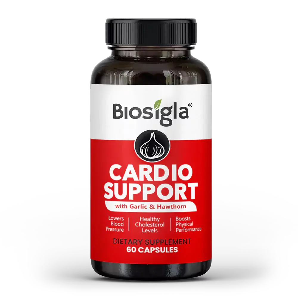 Biosigla - Cardio Support biljne kapsule brzo se apsorbiraju u krvotok, gdje aktivni sastojci djeluju na poboljšanje kardiovaskularne funkcije. Ekstrakt sjemenki grožđa potiče cirkulaciju i jača krvne žile, a list masline pomaže u regulaciji krvnog tlaka i razine kolesterola. Bobice gloga pospješuju protok krvi čime promiču zdravlje srca, a češnjak smanjuje upalu i pomaže u snižavanju kolesterola. Zajedničkim djelovanjem ovi sastojci podržavaju zdrav rad srca, poboljšavaju protok krvi i smanjuju rizik od kardiovaskularnih bolesti, te osiguravaju bolju cirkulaciju i jači, zdraviji kardiovaskularni sustav.