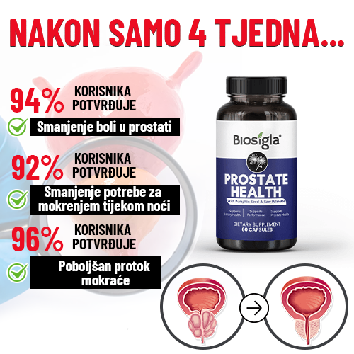 Muči vas često mokrenje tijekom noći, slab protok mokraće ili stalna nelagoda u zdjelici koja vam ometa svakodnevni život? Ovi simptomi, često uzrokovani uvećanom prostatom, mogu dovesti do nemirnih noći, niske energije, čak i utjecati na vaš intiman život. Srećom je tu Biosigla Prostate Health koji nudi moćno i prirodno rješenje. Formuliran klinički dokazanim sastojcima kao što su cink, sabal palma i ekstrakt sjemenki bundeve, pomaže vam u smanjenju prostate, smanjuje česte odlaske u kupaonicu tijekom noći za do 60% i obnavlja ugodu bez rizika od operacije ili lijekova. Preuzmite kontrolu nad zdravljem svoje prostate već danas uz Biosigla Prostate Health i doživite olakšanje kakvo zaslužujete.