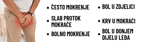 - Često mokrenje: česta potreba za mokrenjem, osobito tijekom noći (nokturija)